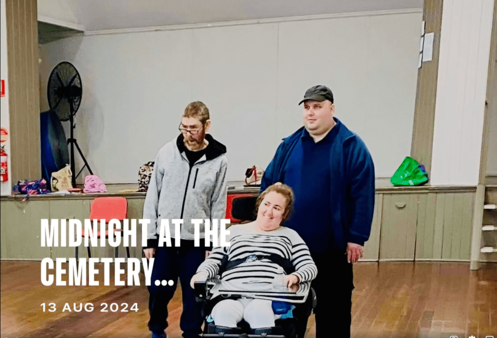 Posted on August 16, 2024August 16, 2024 by veedub11Rehearsal Fun – Midnight at the Cemetery More rehearsal fun for Midnight at the Cemetery. Photos taken by our very own Brigid! Arts Queensland [Image description: A montage of a group of people moving their bodies in interesting ways and smiling.] Share this: Click to share on X (Opens in new window) X Click to share on Facebook (Opens in new window) Facebook Like Loading... Related